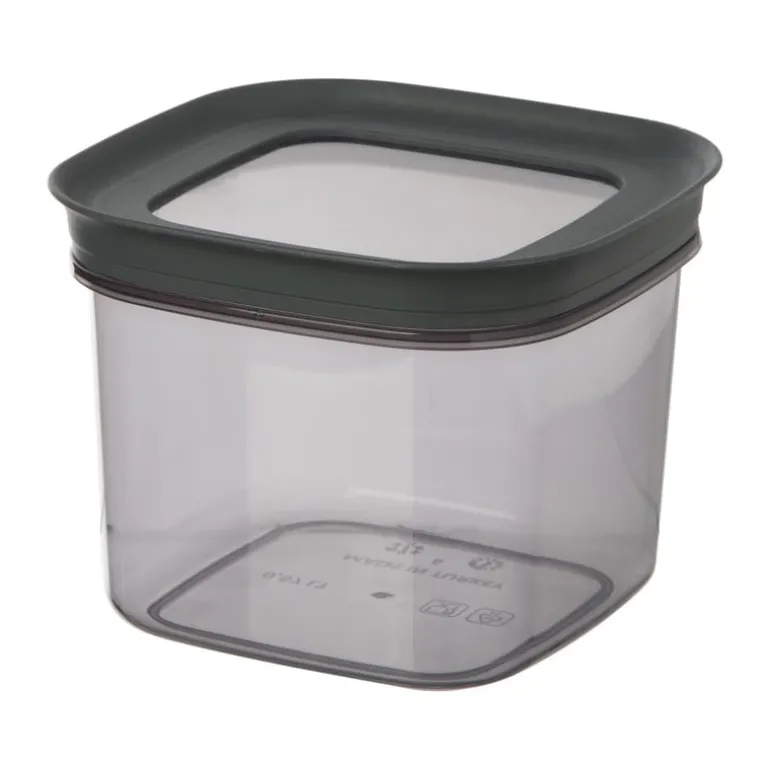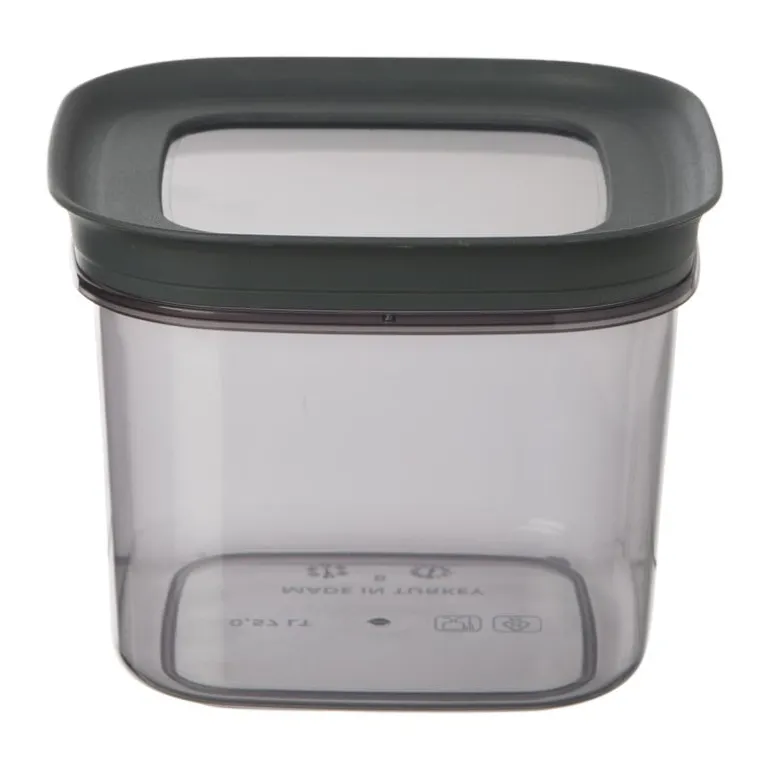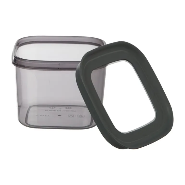 De Vinto voorraadpotten komen in 4 verschillende groottes. Dit is voorraadpot S met een inhoud van 570 ml. Deze voorraadpot heeft een hoogte van 8.5 cm, een breedte van 11 cm en een diepte van 11 cm. De kleur van de voorraadpot is transparant grijs met een grijze deksel.