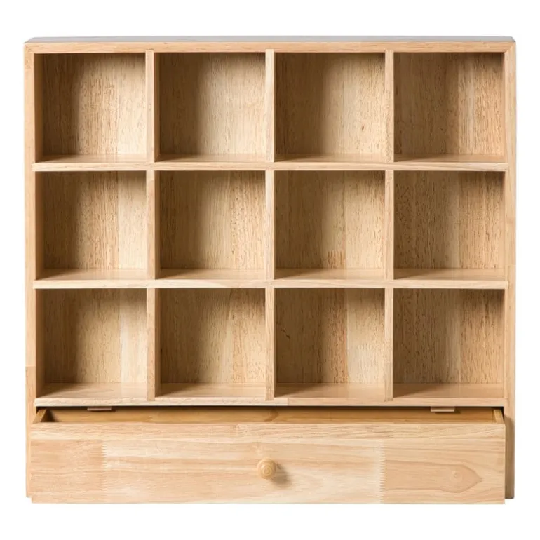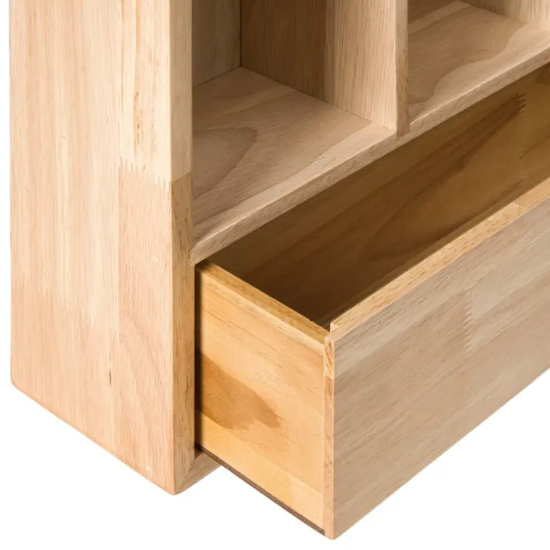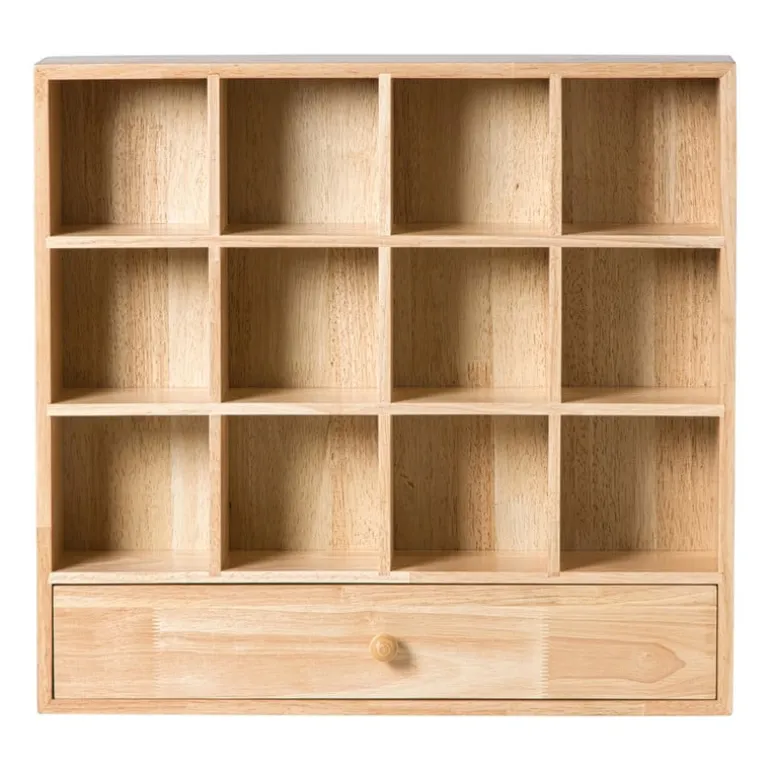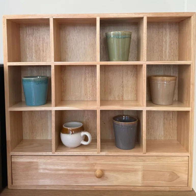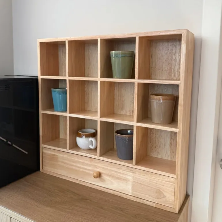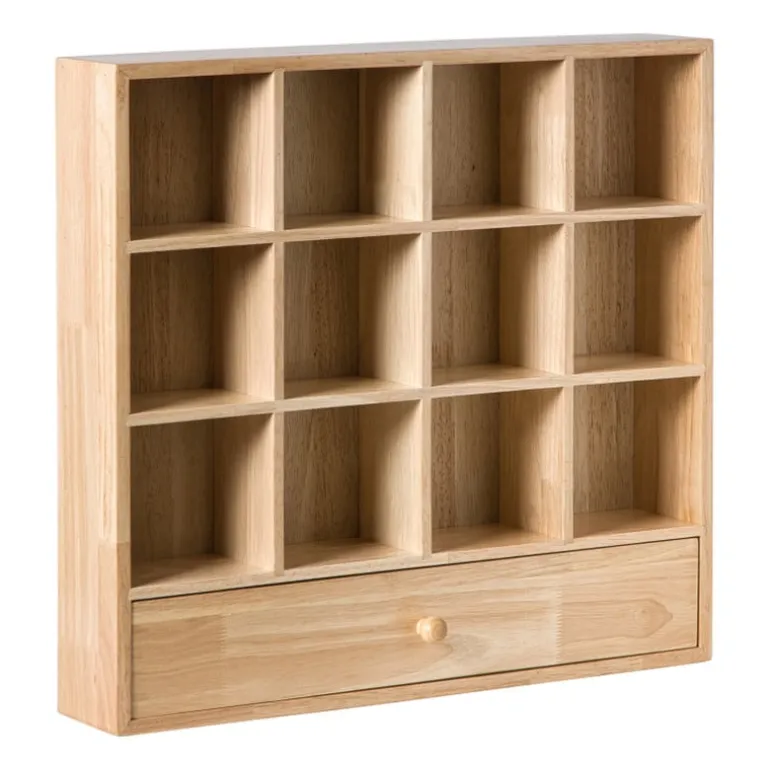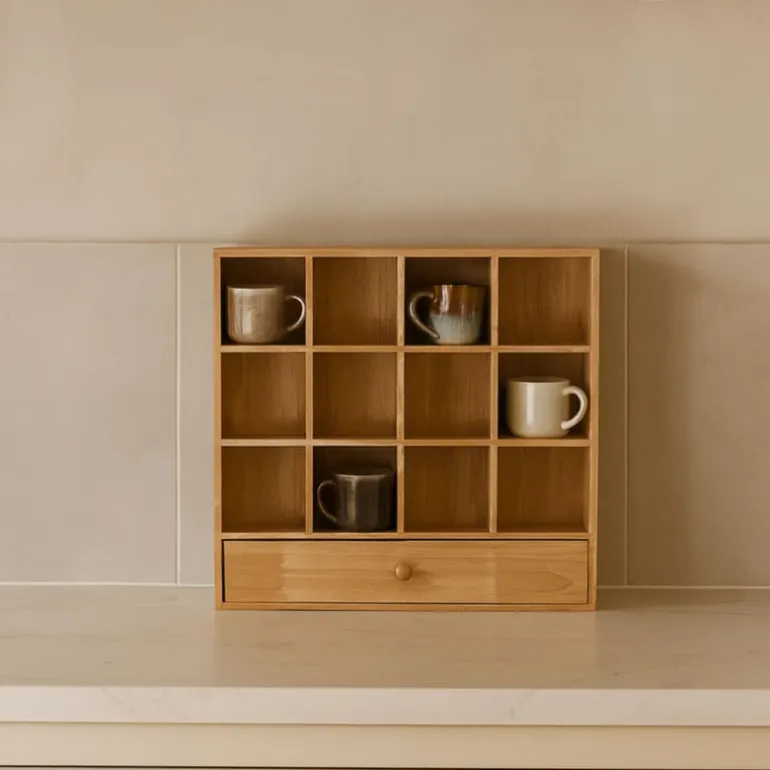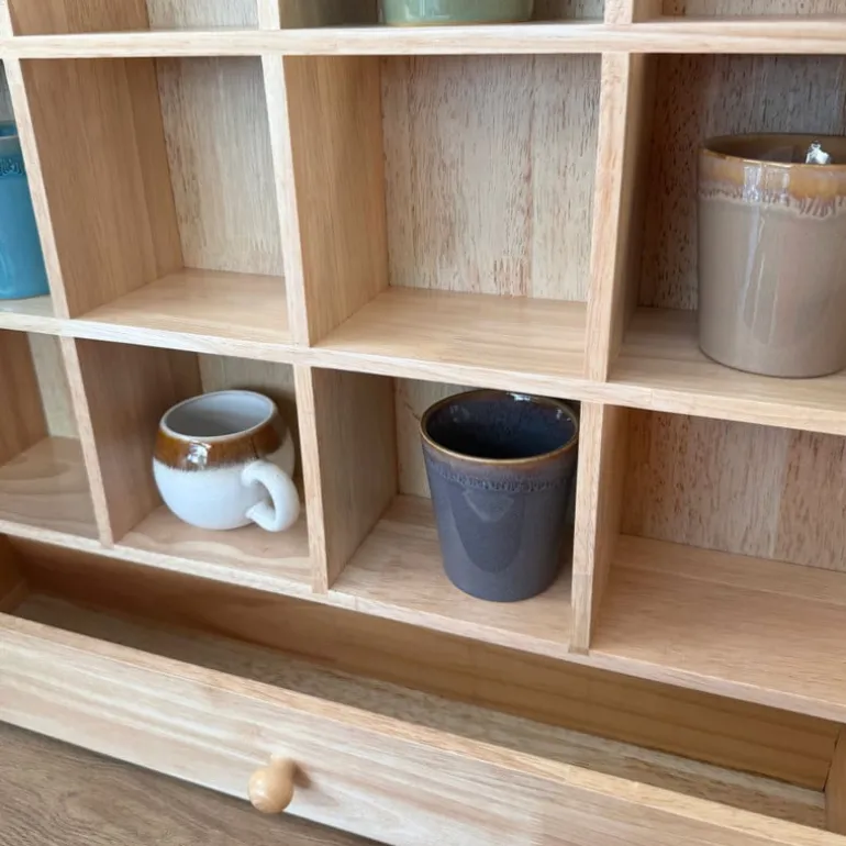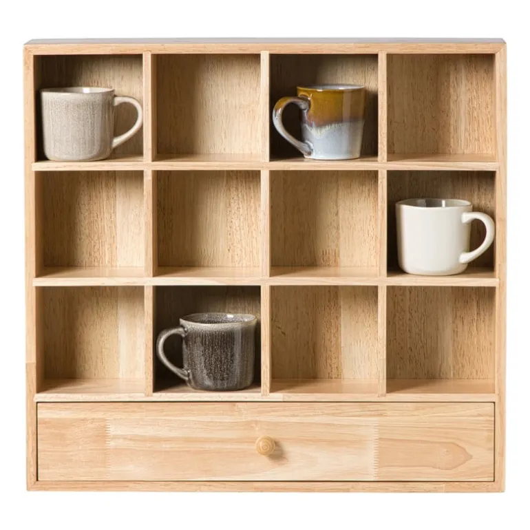 Laat je favoriete mokken stralen! Dit houten wandrek geeft je keuken of koffiehoek een warme, natuurlijke uitstraling. Met zijn 16 vakjes heb je genoeg ruimte om mokken, kopjes of kleine decoraties een plekje te geven. Extra handig: onderaan zit een lade waarin je theezakjes, lepeltjes of andere kleine spulletjes kunt opbergen. Het wandrek is gemaakt van stevig hout in een bruine kleur en heeft een afmeting van 53x50x10 cm. Je hangt het makkelijk aan de muur, waardoor je meteen een stijlvolle Ʃn praktische opberger toevoegt aan je interieur.