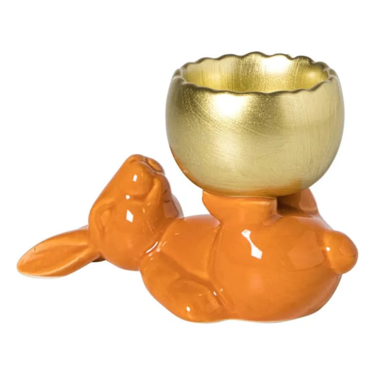 Breng warmte en stijl in je paas interieur met deze elegante waxinelichthouder. Het schattige haasontwerp, gecombineerd met een oranje- en goudkleurige afwerking, maakt dit een perfecte decoratie voor Pasen en het voorjaar. De waxinelichthouder is gemaakt van dolomiet. Met een hoogte van 8.5 cm, een breedte van 13 cm en een diepte van 6.5 cm is deze waxinelichthouder compact genoeg om te plaatsen op een tafeltje, vensterbank of als onderdeel van een paasarrangement. Steek een waxinelichtje aan voor een warme en gezellige sfeer in je huis.