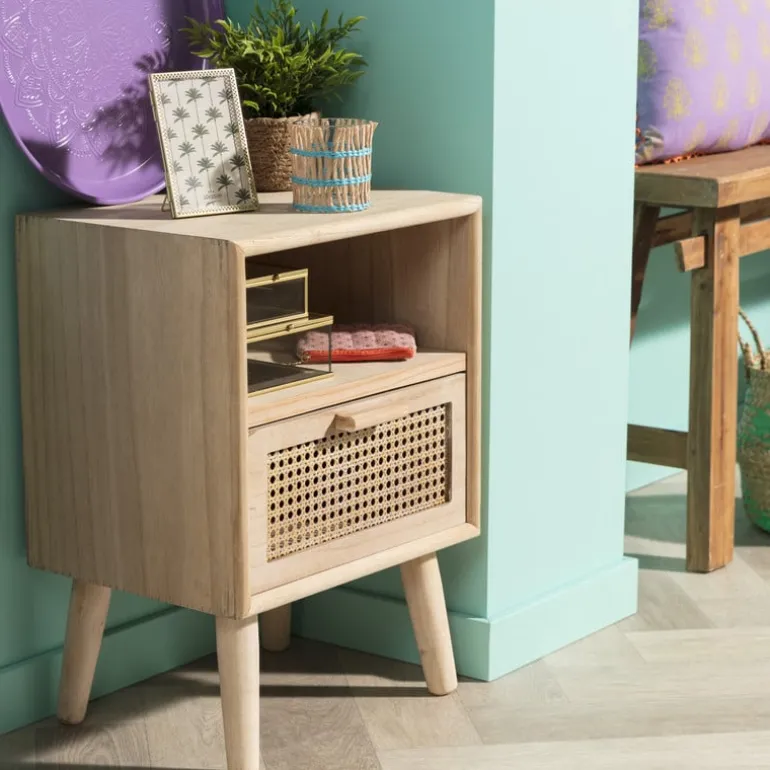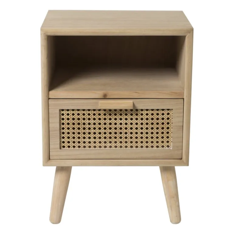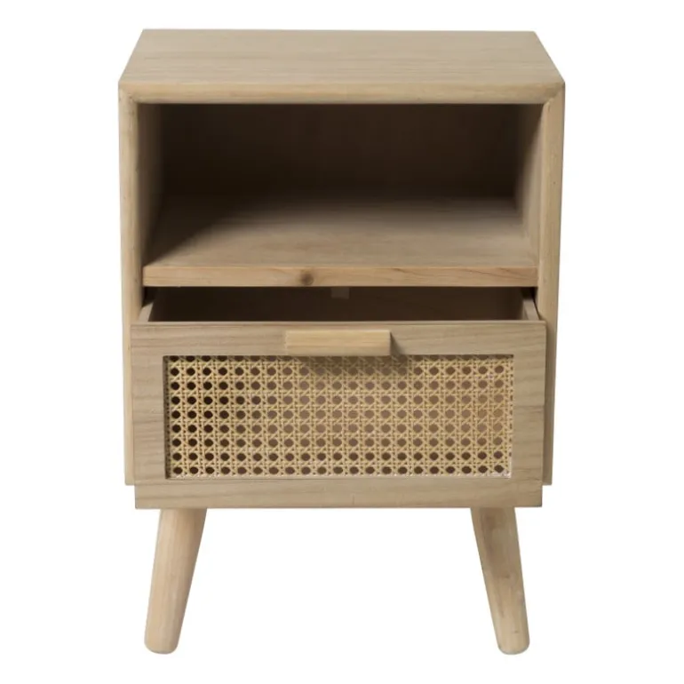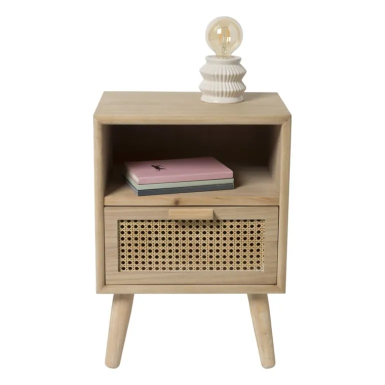 Het nachtkastje heeft een natuurlijke kleur en is gemaakt van hout.