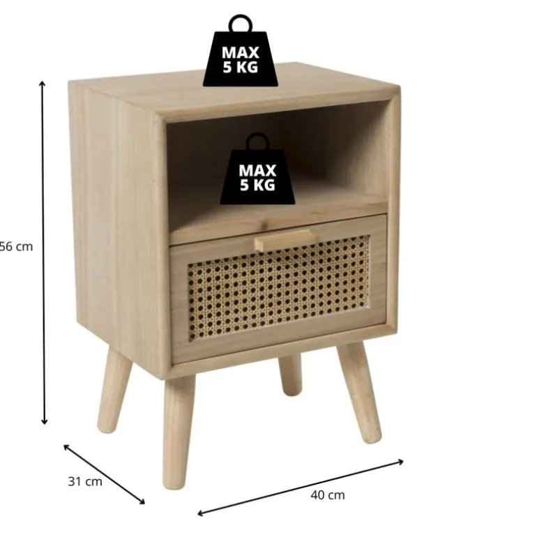 Het plankje en de bovenkant van het nachtkastje hebben ieder een maximaal draagvermogen van 5 kg.