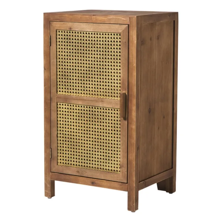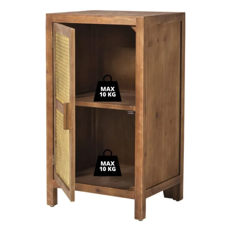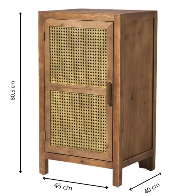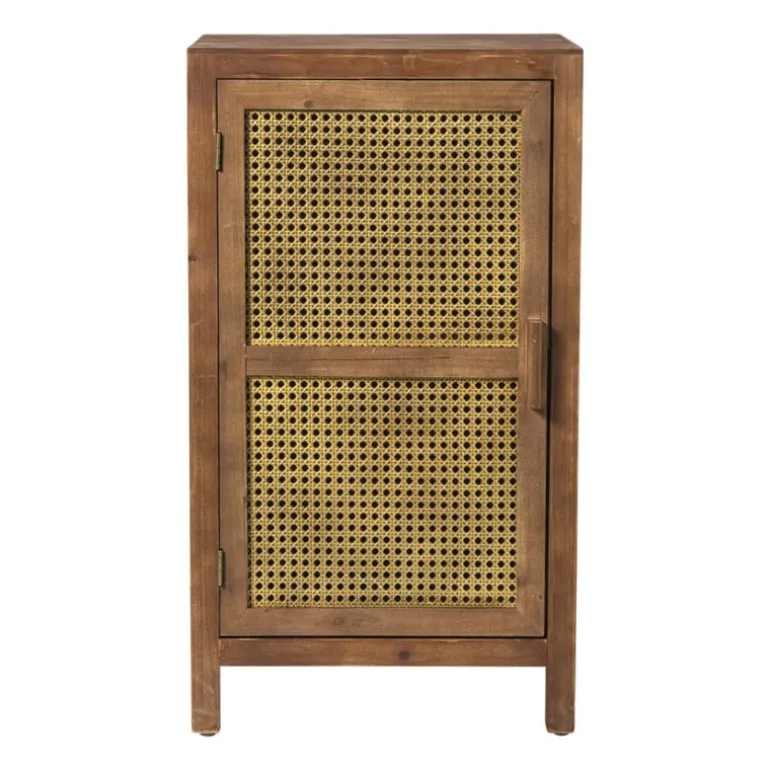 Deze kast is gemaakt van hout en de voorkant van de deurtjes zijn gemaakt van webbing. Webbing is een speciale manier van rotan vlechten en bestaat sinds het begin van de twintigste eeuw, maar is nu helemaal terug van weggeweest! Het vlechtwerk zorgt voor een bohemian en retro look: helemaal van deze tijd dus.