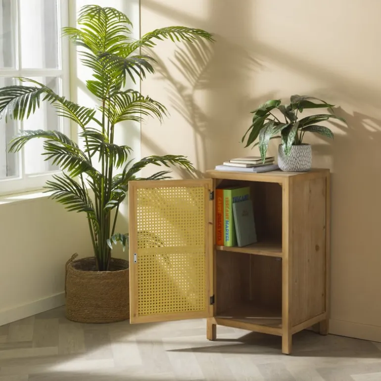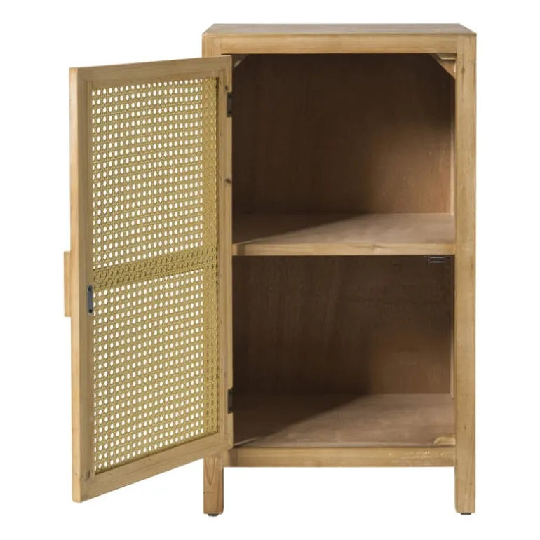 Deze kast is gemaakt van hout en de voorkant van de deurtjes zijn gemaakt van webbing. Webbing is een speciale manier van rotan vlechten en bestaat sinds het begin van de twintigste eeuw, maar is nu helemaal terug van weggeweest! Het vlechtwerk zorgt voor een bohemian en retro look: helemaal van deze tijd dus.