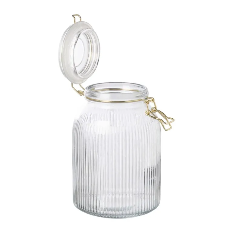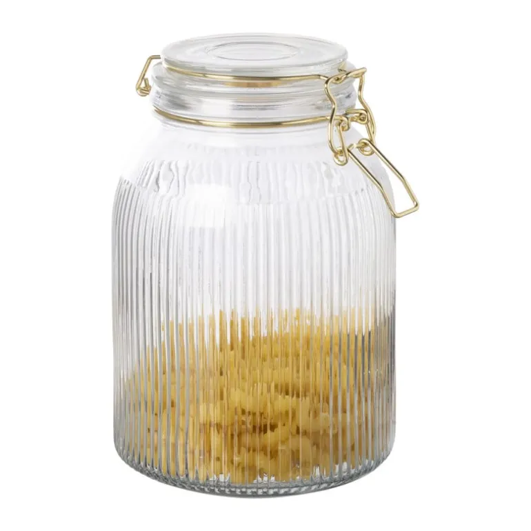 Voeg een elegante, gouden touch toe aan je keuken met deze stijlvolle weckpot. Met een diameter van 13 cm en een hoogte van 20 cm is deze pot perfect voor het bewaren van kleine ingrediƫnten, zoals specerijen, noten of snoepjes. De gouden accenten zorgen voor een luxe uitstraling en de ribbelstructuur zorgt voor een moderne touch.