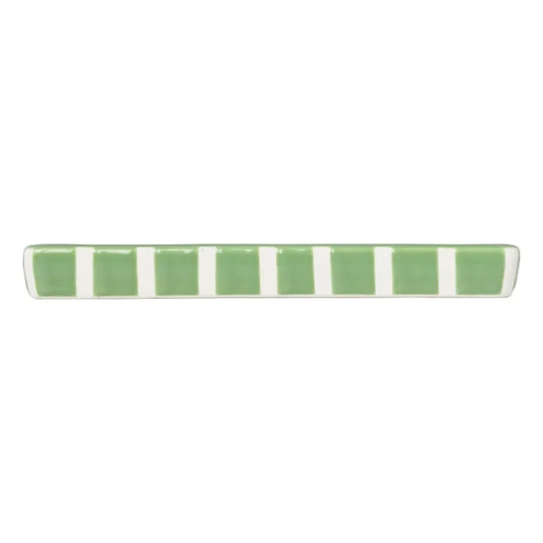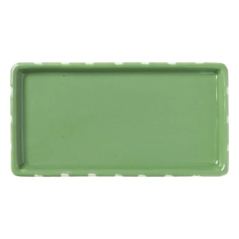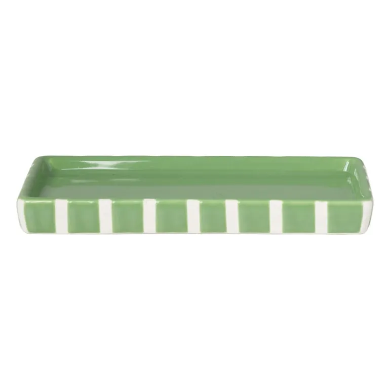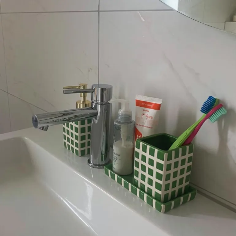 Breng een moderne touch in je badkamer of keuken met dit stijlvolle zeepschaaltje. Het schaaltje is niet alleen praktisch, maar ook een echte eyecatcher in jouw badkamer, wc of keuken. Het zeepschaaltje heeft een rechthoekige vorm en heeft een trendy blokjespatroon in het groen met witte lijnen. Het zeeppompje en de tandenborstel beker van deze serie passen precies in dit schaaltje. Je kunt er ook je favoriete stuk zeep of je sieraden op leggen. Het compacte formaat zorgt ervoor dat het schaaltje gemakkelijk op je wastafelblad of plank past.
