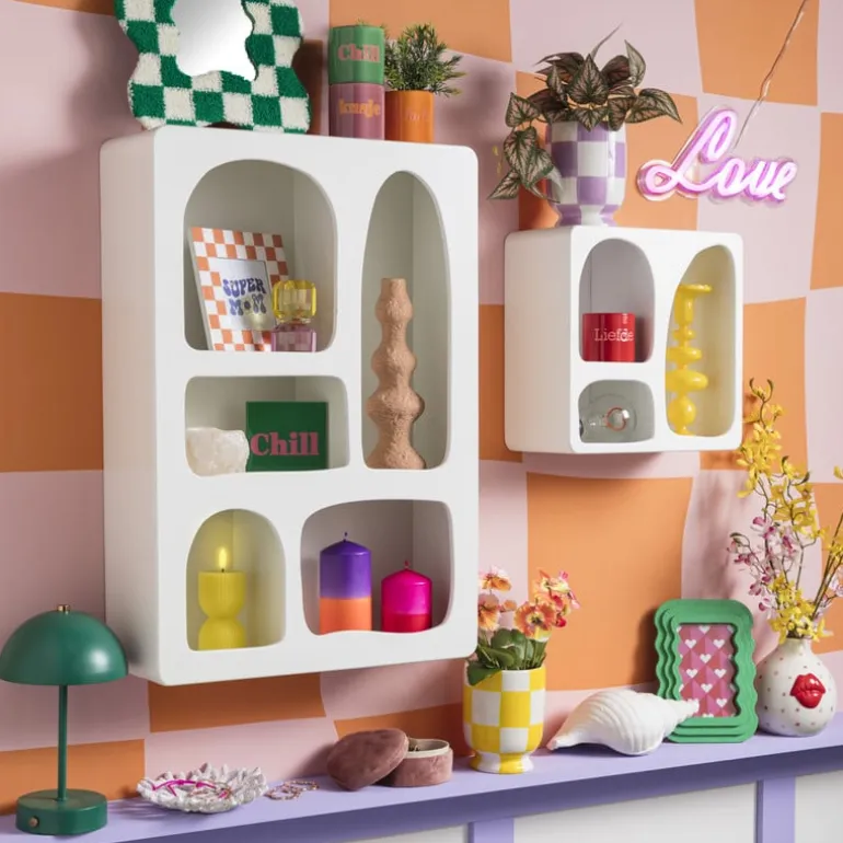 De vakkenkast komt in zijn geheel, dus je kan meteen beginnen met stylen! Aan de achterkant zitten 2 handige gaten waar aan je het kastje gemakkelijk kan ophangen of vastmaken aan de muur om kantelen te voorkomen.