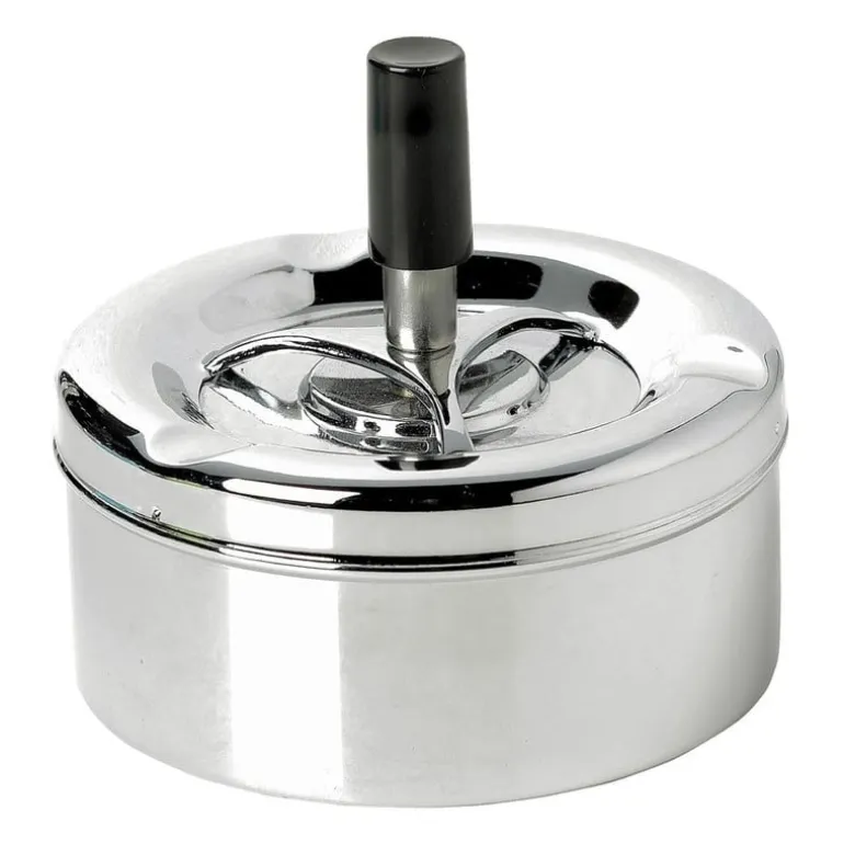 Deze asbak met drukknop is gesloten waardoor het model bestand is tegen de wind. Daarnaast houdt het gesloten model de geuren van de afgeslagen as binnen, zodat er minder luchtjes van de asbak komen. Het chromen model heeft een omtrek van 11 cm waardoor hij groot genoeg is voor meerdere sigaretten. Het model heeft een stoer en robuust uiterlijk dat pas op elke tafel.