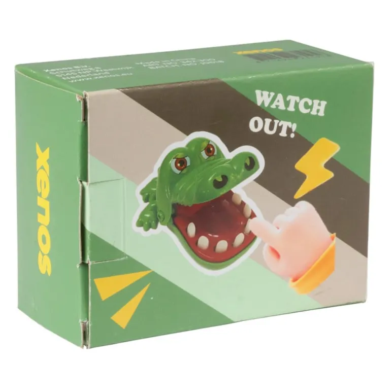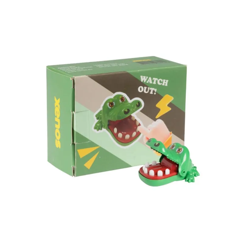 Deze krokodil heeft kiespijn! Als je op de verkeerde tand drukt, gaat de bek van de krokodil met een klap dicht. Dit betekent dat de speler verliest en de ronde eindigt. Het spel gaat door totdat er één speler als laatste overblijft. De krokodil is 6x8x4 cm en heeft een kleine opening aan de bovenkant waardoor je het spel gemakkelijk aan een ketting kan rijgen.