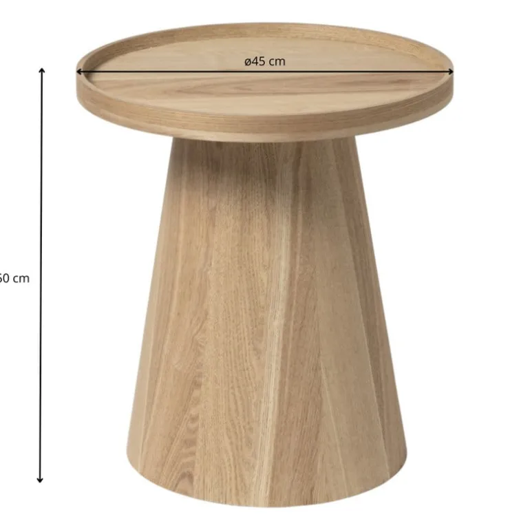 De bijzettafel heeft een doorsnede van 45 cm en een hoogte van 50 cm.
