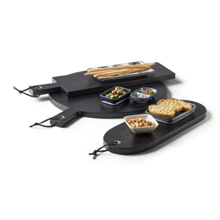 Ze zeggen dat liefde door de maag gaat, maar het oog wil ook wat! Verras jouw gasten door de lekkerste hapjes uit te serveren op deze ovale zwarte serveerplank. De afmetingen van dit plankje zijn 42×15 cm en het is gemaakt van Acacia hout.