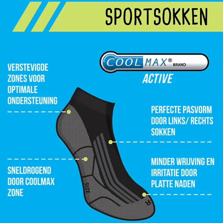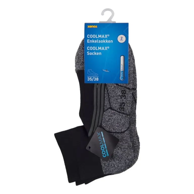 Met deze coolmax enkelsokken heb jij geen last van zere voeten tijdens een stevige wandeltocht. Deze sokken zijn gemaakt van 42% polyester, 42% katoen, 14% polyamide, 2% elastine. De sokken zijn perfect voor een lange wandeltocht, maar ook heerlijk om dagelijks te dragen. De sokken mogen gewassen worden op 40 graden Celsius. De enkelsokken hebben een uitstekende vochtafvoer en zijn snel drogend. Een verpakking bevat 2 paar sokken.Ā