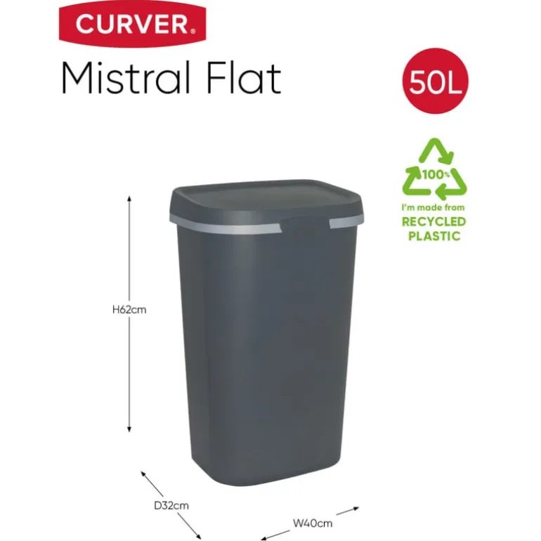 Deze grote mistral flat prullenbak is een topper in zowel formaat als duurzaamheid. Met een royale inhoud van 50 liter en een minimalistisch design is hij perfect voor het huishouden. Het klapdeksel maakt weggooien eenvoudig, en hij is gemaakt van 100% gerecycled plastic.