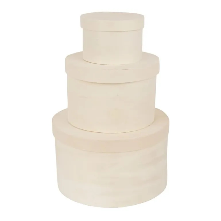 Deze set van drie doosjes is perfect om te versieren met verf, glitters, kraaltjes, papier, vilt, textiel of washi tape bijvoorbeeld. Het kleinste doosje is 6 cm hoog en heeft een diameter van 8.5 cm, het middelste formaat is 9.5 cm hoog en heeft een diameter van 13 cm. Het grootste doosje is 10 cm hoog en heeft een diameter van 17 cm.