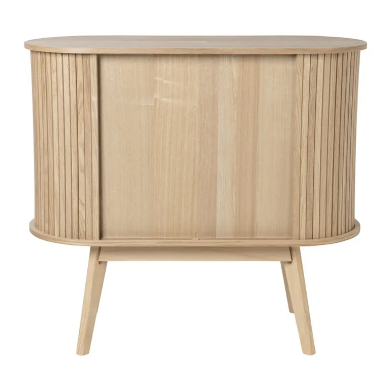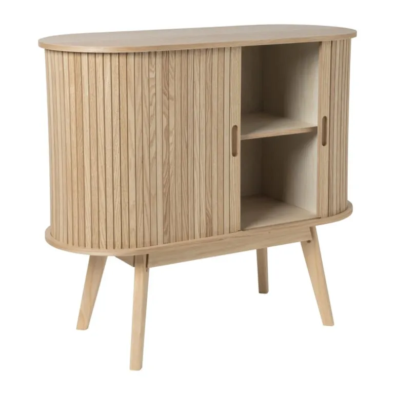 Dit dressoir combineert een minimalistisch design met natuurlijke materialen, wat zorgt voor een rustige en verfijnde uitstraling in elke ruimte. Het dressoir biedt voldoende ruimte om je favoriete decoratie, boeken of kleine planten neer te zetten in je hal, woonkamer of slaapkamer. Sidetable Uppsala past bij vrijwel ieder interieur en is geïnspireerd op de populaire Scandinavische woonstijl. Het is een echte eyecatcher dankzij het ovalen bovenblad, de verticale strepen en de hoge poten.