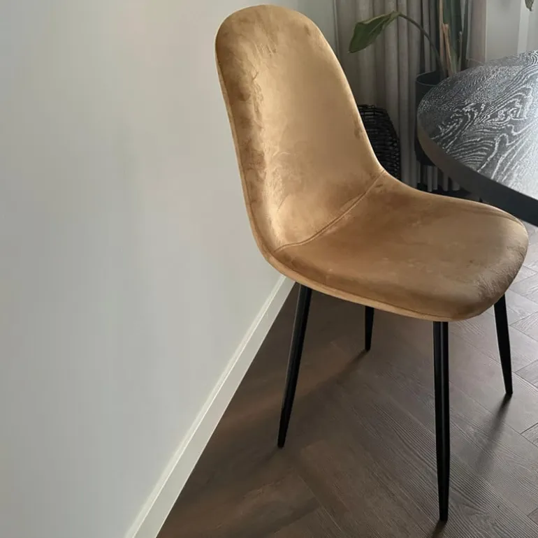 De eetkamerstoel is gemaakt van velvet en metaal en is lichtbruin van kleur.