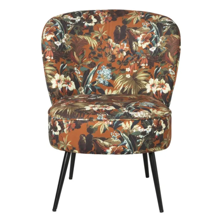 De fleurige fauteuil is gemaakt van velvet.