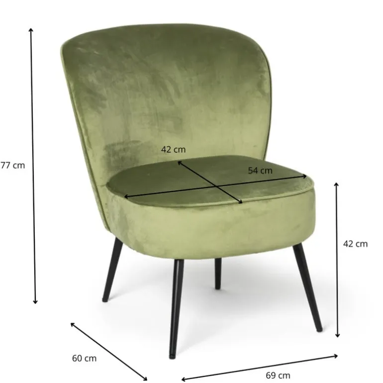 De Frida stoel heeft een hoogte van 77 cm, een breedte van 69 cm en een diepte van 60 cm. De zithoogte van deze fauteuil is 42 cm, de zitbreedte 54 cm en de zitdiepte 47 cm.