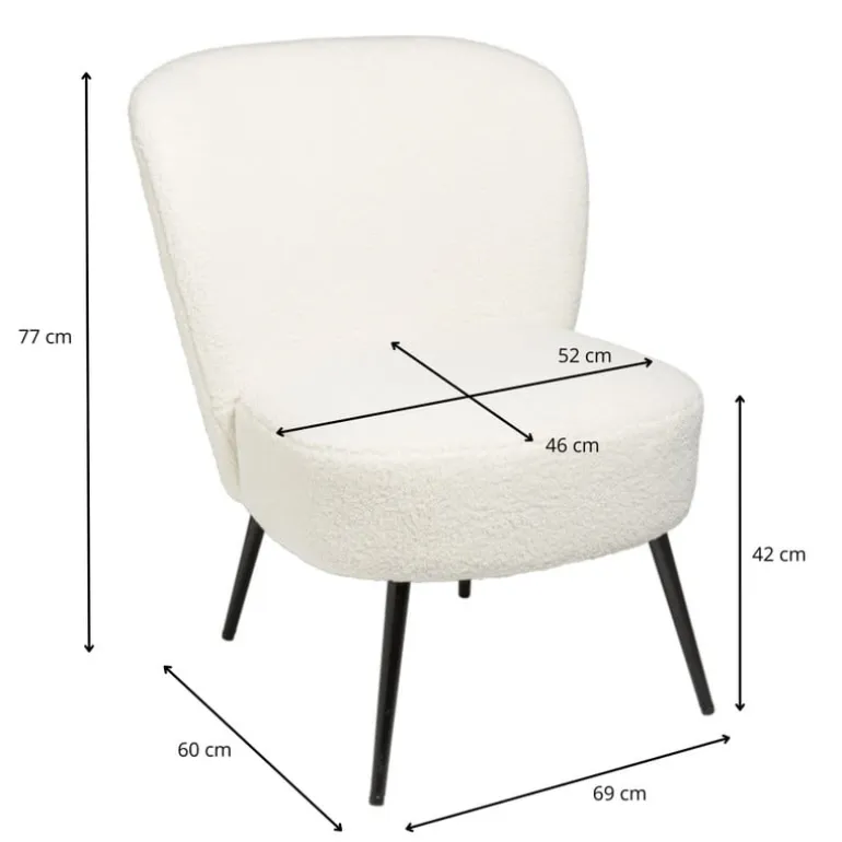 De stoel heeft een hoogte van 77 cm, een breedte van 69 cm en een diepte van 60 cm. De zithoogte van de fauteuil is 42 cm, de zitbreedte is 52 cm en de zitdiepte is 46 cm.