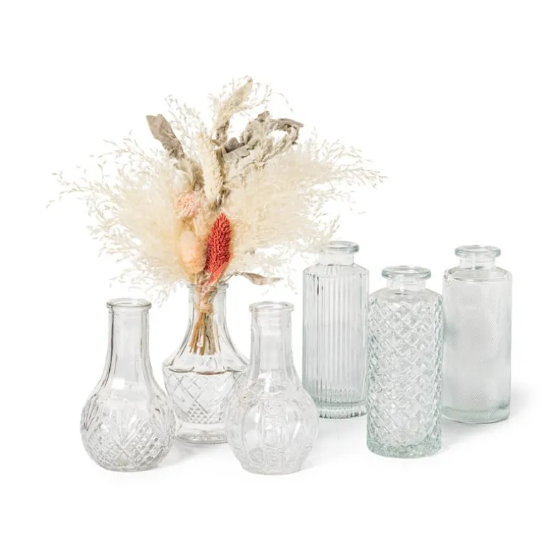 Deze leuke flesvaasjes zijn ideaal om tussen andere decoratie items te zetten. Ga met de trends mee en zet er droogbloemen in of leuke lichtjes voor een kleine gezellige lamp. De vaasjes zijn gemaakt van glas en zijn er in 3 verschillende varianten. De afmeting is 6x6x11.5 cm.