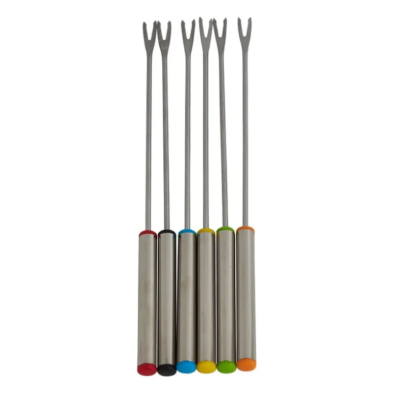 Deze fondueprikkers zijn onmisbaar voor bij het fonduen. De prikkers worden geleverd in een set van 6. Ze zijn gemaakt van RVS. De uiteindes hebben ieder een eigen kleurtje zodat je de prikkers makkelijk uit elkaar houdt.
