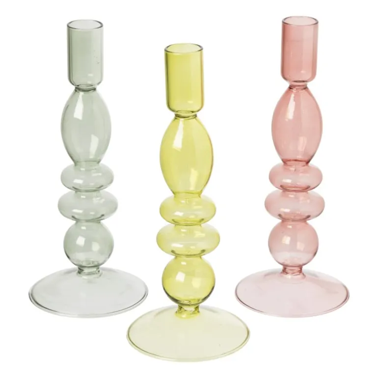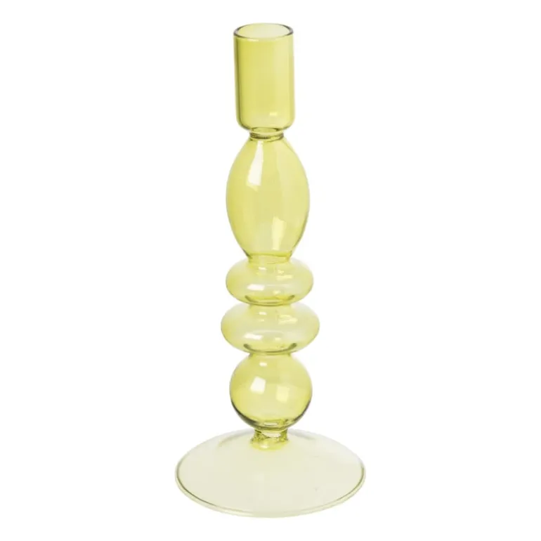 Gezellig dineren doe je met deze glazen kandelaar. Maak met deze kandelaar een mooie tafelsetting en geniet van een heerlijke avond. De glazen kandelaar is een echte trend van dit moment. Dit is een super kandelaar om toe te voegen aan jouw interieur! In het glas zitten mooie bollingen die zorgen voor een luxe maar speels effect. Deze groenkleurige kandelaar is gemaakt van glas en heeft een afmeting van ø9×22.5 cm. De kandelaar is in meerdere kleuren verkrijgbaar.