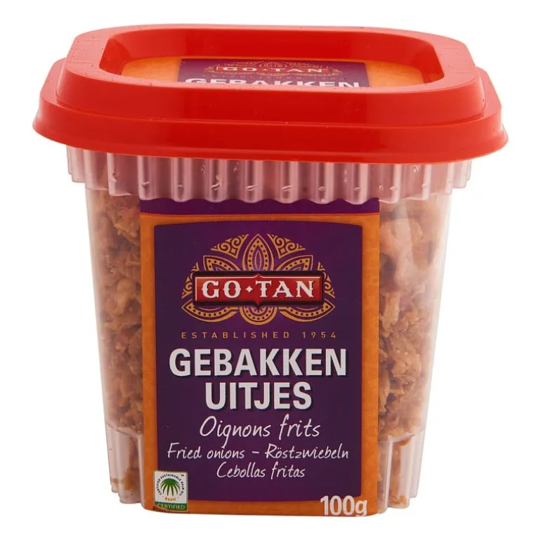 Deze gebakken uitjes zijn heerlijk voor bij de rijsttafel, nasi of bami. Ze maken je oosterse gerecht helemaal af. De gebakken uitjes hebben een knapperige bite en ze zijn gemaakt door het bekende merk Go-Tan. In het potje zit 100 gram gebakken uitjes. Ook verkrijgbaar in een zak van 500 gram.