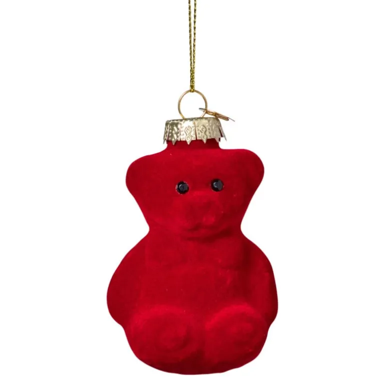 Deze rode gummybeer-hanger van zacht velvet voelt knuffelig aan en geeft je kerstboom een vrolijke twist. Perfect voor wie houdt van een speelse en originele kerstsfeer.
