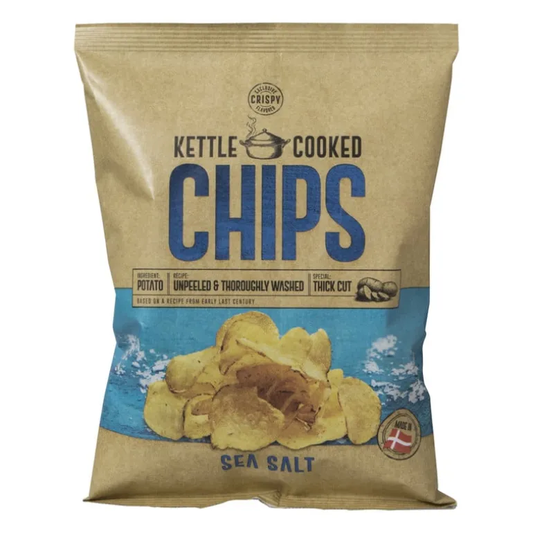 Kettle Cooked Chips zijn dikker gesneden voor de unieke Kettle crunch. Geniet van de smaakvolle chips uit Denemarken in de smaak: zeezout. Deze ambachtelijke chips worden zorgvuldig bereid volgens een traditioneel kookproces, waarbij iedere aardappel langzaam wordt gefrituurd tot in de perfectie. Het resultaat? Een heerlijke, krokante chip met een rijke, volle smaak die je blijft verrassen. Of je nu een feestje organiseert, een filmavond hebt, of gewoon zin hebt in een knapperige snack, onze Kettle Cooked Chips met zeezout zijn de perfecte keuze.