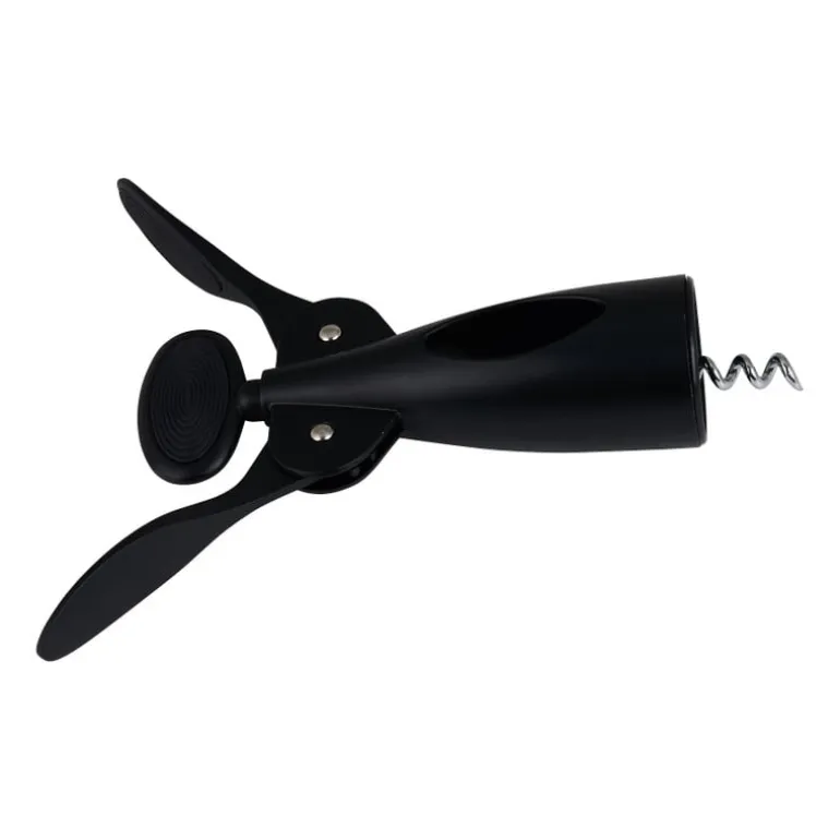 Een fles wijn is zo geopend met deze handige kurkentrekker. Het werkt heel eenvoudig. Zet de krukkentrekker boven op een kurk met de hendels naar boven. Duw vervolgens de hendels stevig tegen naar beneden. De haak trekt de kurk moeiteloos uit de fles. De mat zwarte kurkentrekker is gemaakt van metaal.