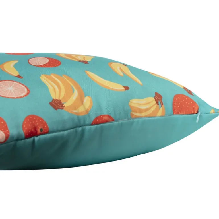 Dit vierkante kussen versierd met bananen en manderijntjes geeft je interieur een speelse en fruitige touch. De blauwe achtergrond met het vrolijke patroon van bananen en mandarijntjes maken het kussen extra leuk als decoratie in een slaapkamer, kinderkamer of loungehoek.
