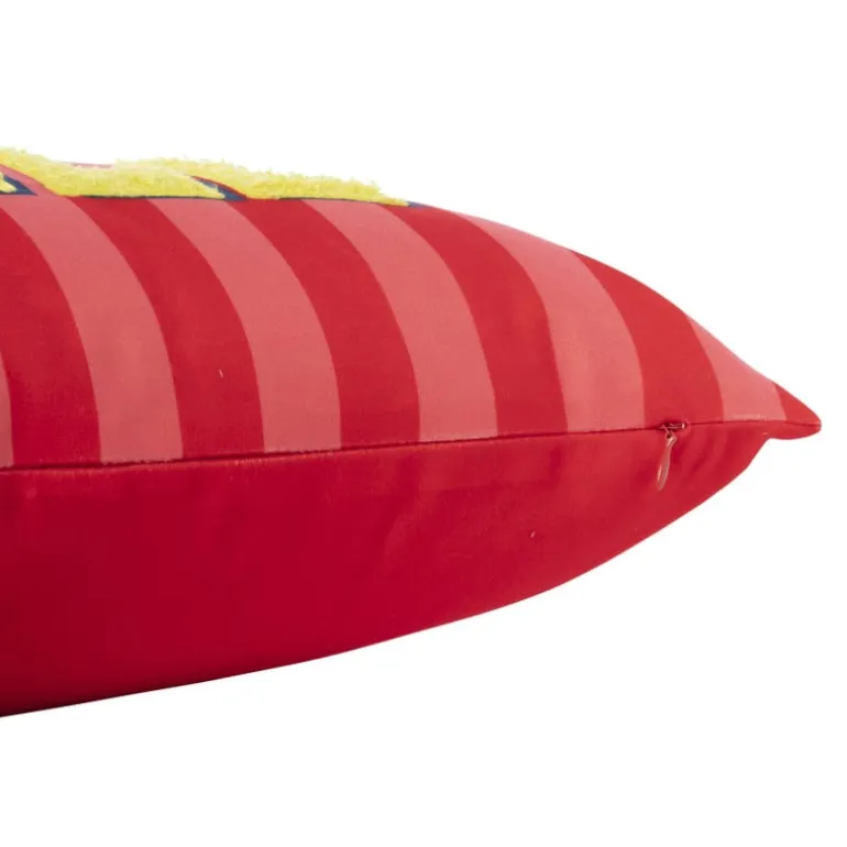 SMILE! Dit roze-rode gestreepte kussen met gele letters SMILE erop is perfect op jouw bank, stoel of palletbank. De langwerpige vorm maakt ‘m perfect om lekker tegenaan te leunen terwijl jij geniet van je favoriete serie, een goed boek of een lazy sunday afternoon.