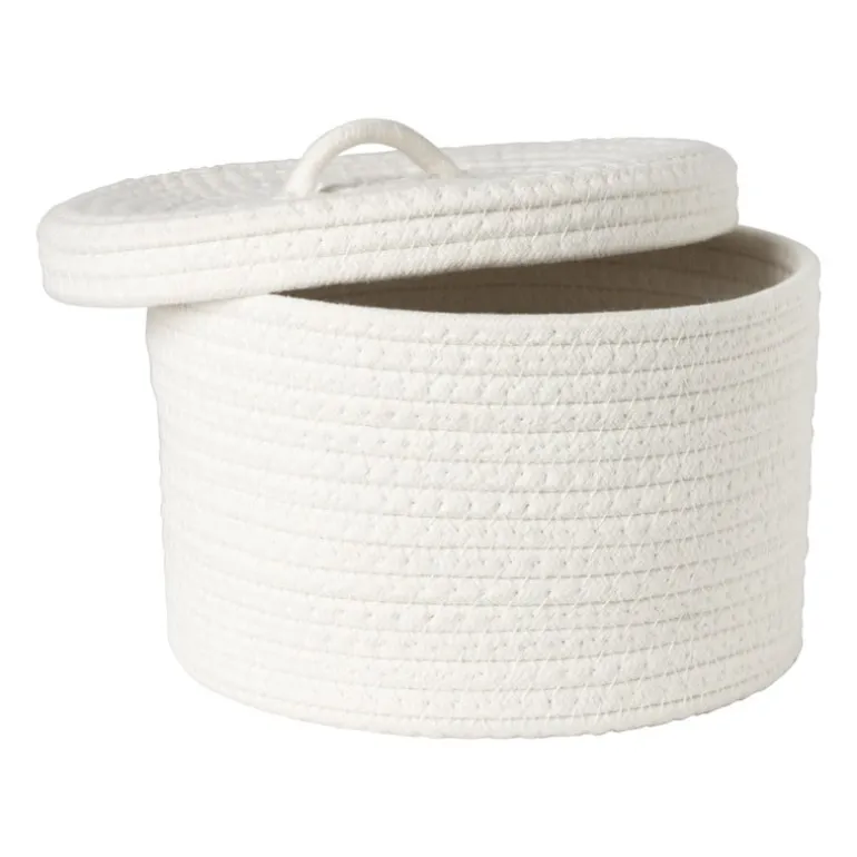 Manden zijn altijd goed om een beetje structuur te geven aan jouw leefomgeving. Deze handige mand met deksel is mooi en multifunctioneel in gebruik. De mand met deksel Julia is gemaakt van polyester en katoen een heeft een witte kleur. De mand heeft een diameter van 25 cm en een hoogte van 15 cm.