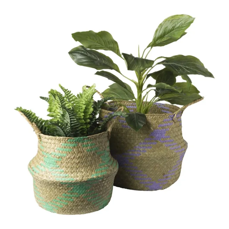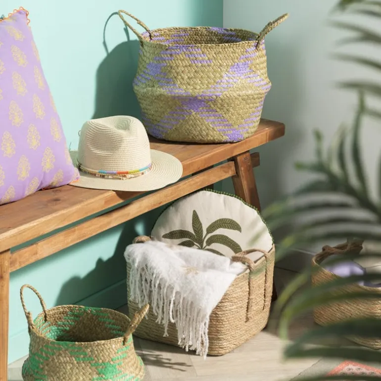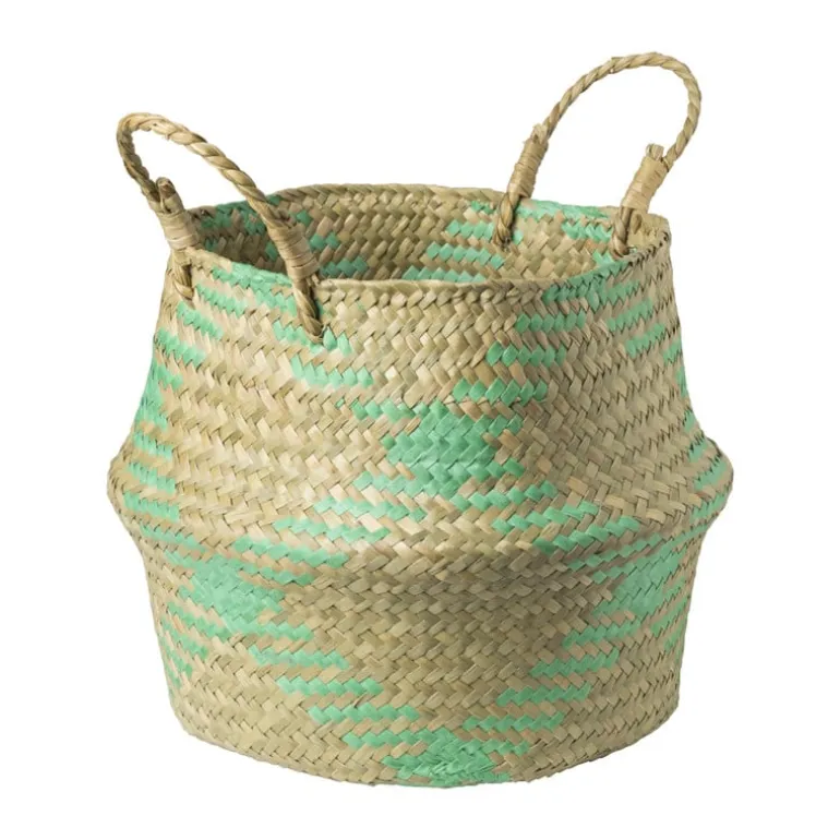 Deze gevlochten mand brengt sfeer én orde in huis! Gemaakt van stevig zeegras en afgewerkt met een vrolijk patroon in turquoise. Dankzij de flexibele handvatten verplaats je de mand eenvoudig van de woonkamer naar de slaapkamer of badkamer. Perfect voor het opbergen van plaids, speelgoed of wasgoed. Ook leuk als decoratief item met een plant erin! Praktisch én stijlvol – een echte must-have voor jouw interieur. De mand heeft een hoogte van 28 cm en een diameter van 23 cm.