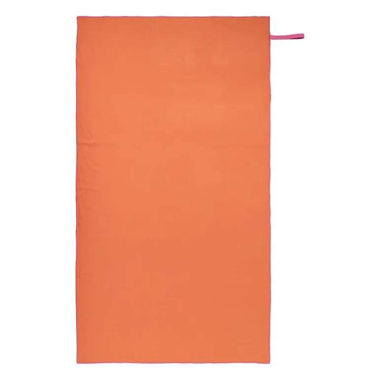 De microvezel handdoek is oranje van kleur en heeft roze details. Daarnaast is de handdoek voorzien van een handig ophanglusje en een elastische band die om de opgevouwen handdoek kan worden bevestigd.