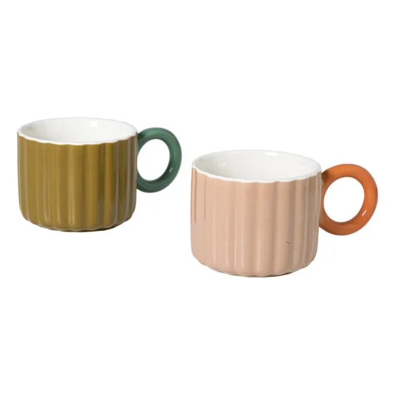 Met hun speelse ribbelstructuur en contrasterende oortjes zijn ze niet alleen fijn om uit te drinken, maar ook een feestje om naar te kijken. De combinatie van matte buitenkant en glanzend wit vanbinnen maakt ze helemaal af. Met een inhoud van 200 ml zijn ze perfect voor een espresso, een kleine koffie of een fijne kop thee tussendoor.