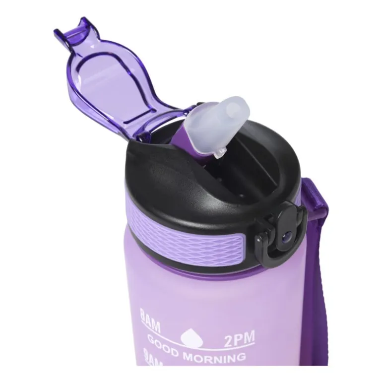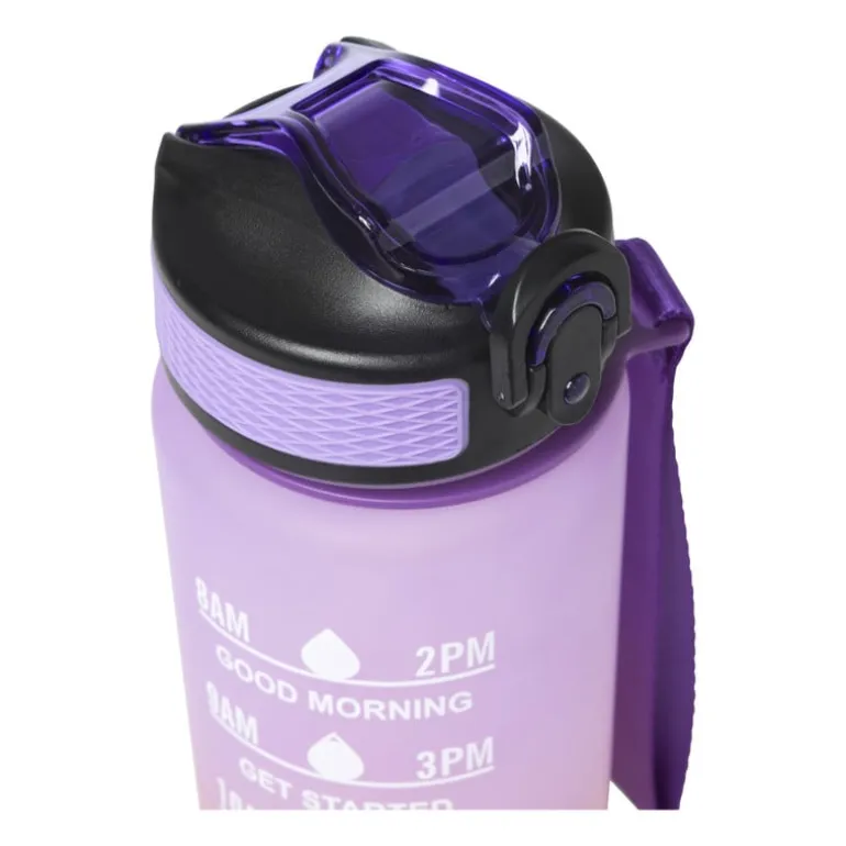 De waterfles heeft een mooie kleurverloop van paars naar roze, is voorzien van een handig polsbandje en heeft een dop om lekken te voorkomen. Daarnaast is de waterfles gemaakt van kunststof, een sterk en duurzaam materiaal.