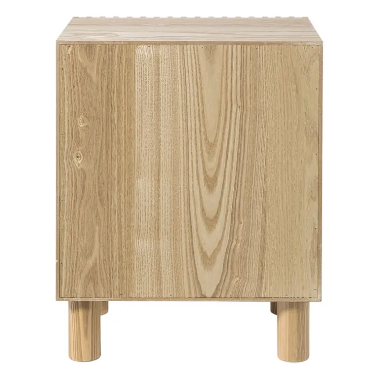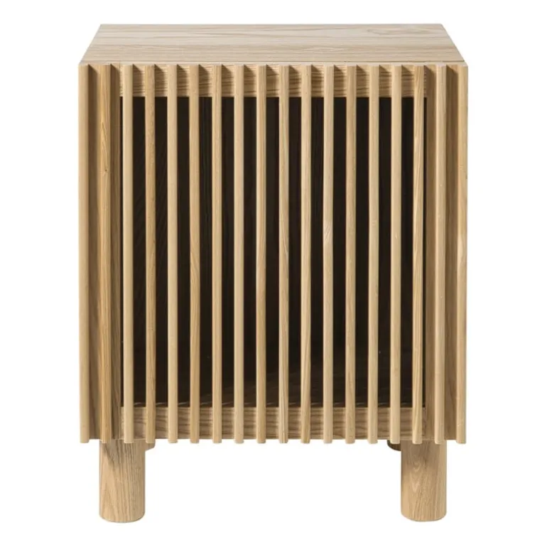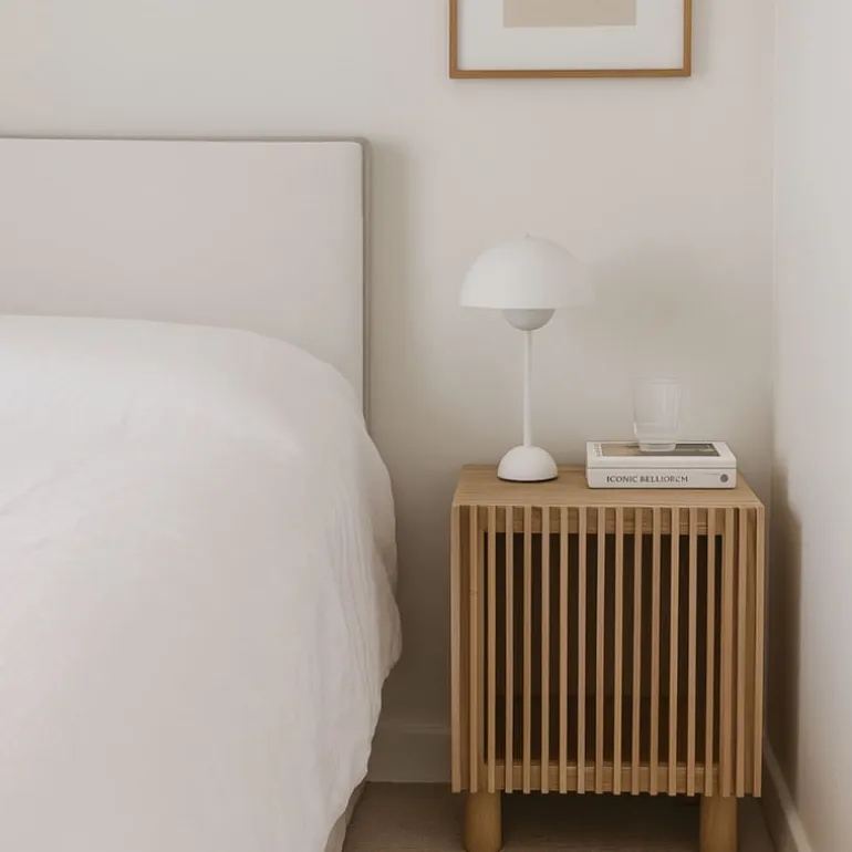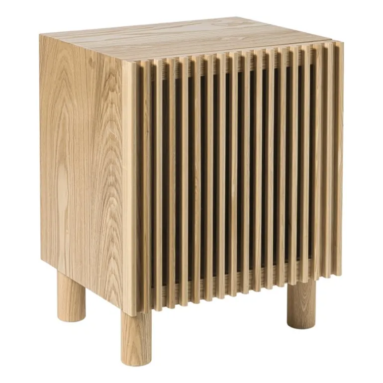 Dit nachtkastje past perfect naast je bed en is ideaal om je essentials in op te bergen: je favoriete boek, oplaadkabels of andere spullen. De open lattenstructuur zorgt voor een lichte uitstraling, terwijl de warme houttint gezelligheid toevoegt aan je slaapkamer. Combineer ‘m met een minimalistisch bedframe en wat zachte linnen voor die ultieme Japandi vibe.