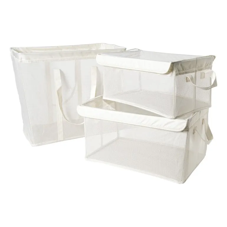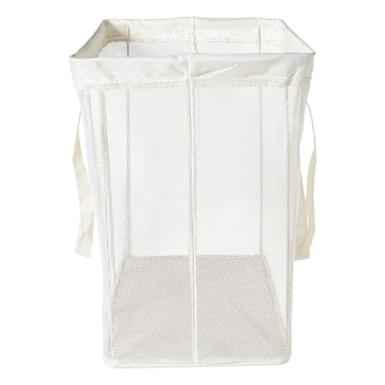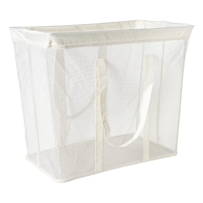 Deze grote witte opbergmand met handvatten is dé oplossing voor rondslingerende was, speelgoed of plaids. Dankzij het ademende mesh-materiaal zie je in één oogopslag wat erin zit, en met de stevige handvatten til je ‘m zo van de ene naar de andere kamer. Licht, luchtig en lekker ruim – deze mand is praktisch én past in elk interieur.