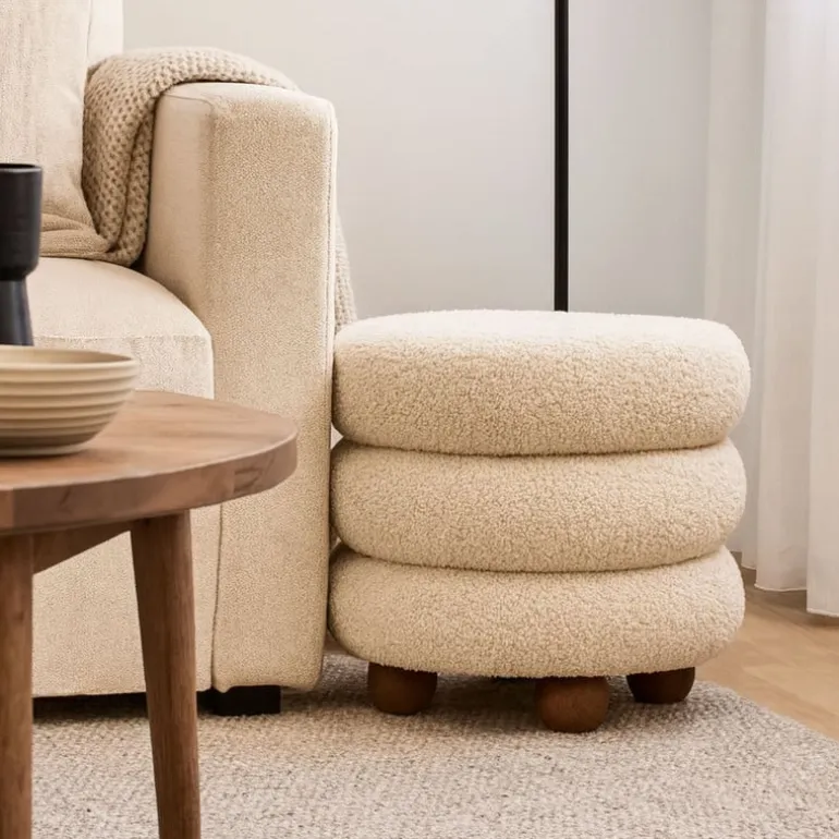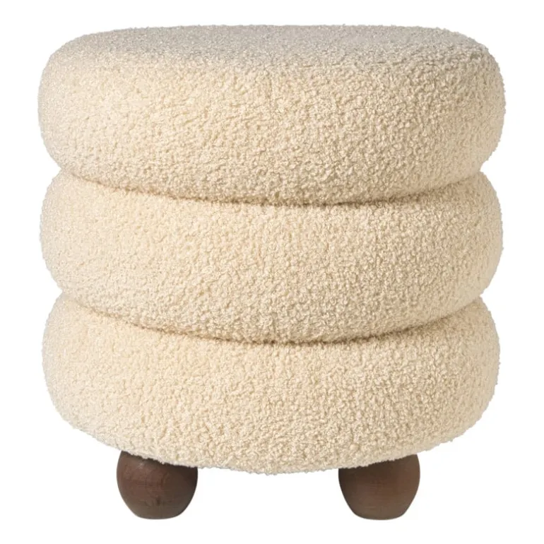 Deze poef steelt gegarandeerd de show in jouw interieur. Het bubbeldesign in drie lagen geeft een speelse twist, terwijl de zachte bouclé-stof zorgt voor een knusse en moderne uitstraling. De ronde houten pootjes maken het geheel helemaal af! Gebruik ’m als extra zitplek, voetenbankje of stijlvol accessoire in je woonkamer, slaapkamer of kinderkamer. De beige kleur is neutraal en daardoor makkelijk te combineren.