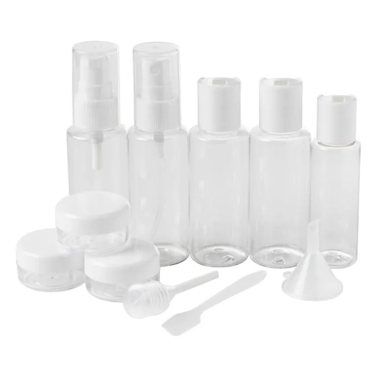 Gebruik gewoon je favoriete shampoo op vakantie door deze reisflessen te vullen. Je neemt precies de juiste hoeveelheid mee. Daardoor bespaar je ruimte en gewicht voor andere spullen of souvenirs van de reis. Er zitten verschillende flesjes en potjes in de set. Inhoud: 2 flesjes met klepsluiting, 1 flesje met spray dop, 1 flesje met pomp dop, 1 flesje met pompsluiting 2 grote potjes voor crĆØme en 1 klein potje voor creme of zalf.
