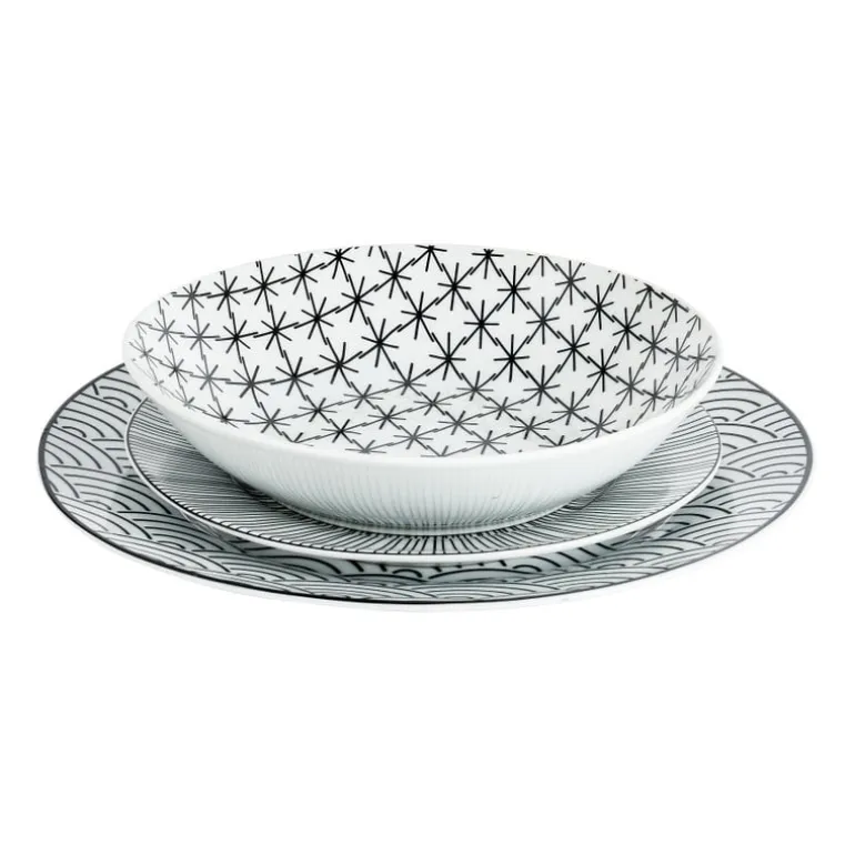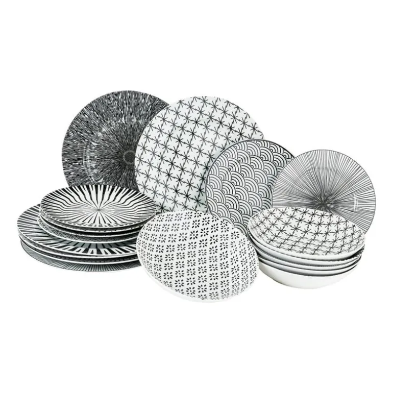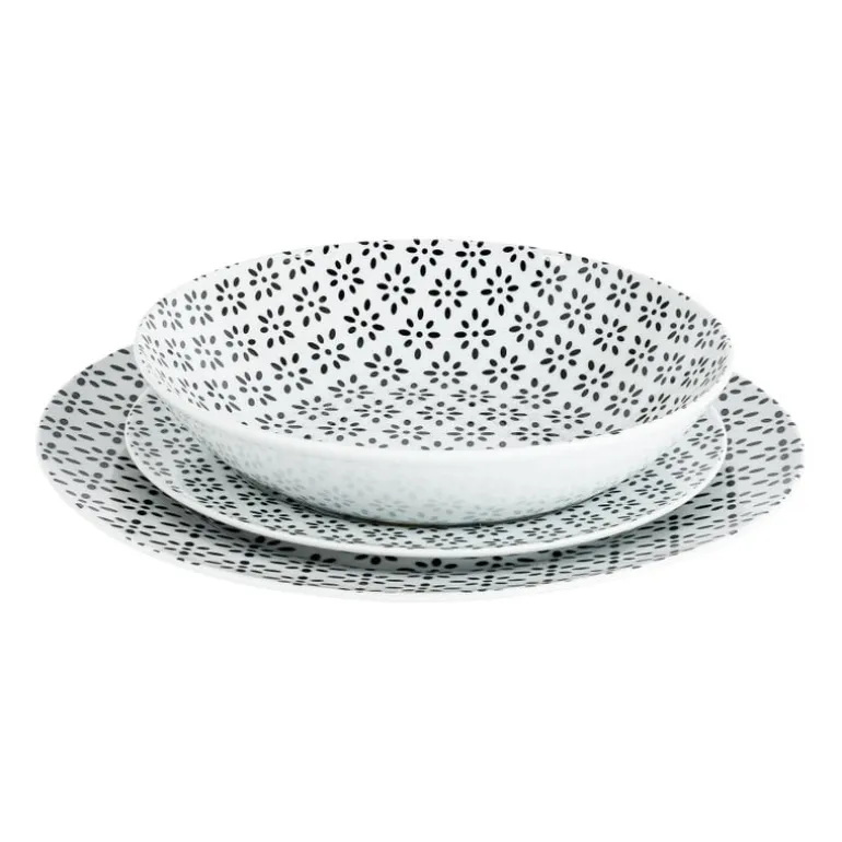 Op zoek naar leuke borden met een printje? In serviesset Seoul zit precies wat je zoekt. In de 18-delige set zitten 6 dinerborden (27 cm), 6 diepe borden (20,5 cm) en 6 ontbijtborden (20 cm). Stuk voor stuk voorzien van een speels maar subtiel patroon. Door de neutrale kleuren makkelijk te combineren met andere mokken, kommen en bekers in de kleuren zwart of wit. Ook verkrijgbaar in de kleuren blauw/wit.