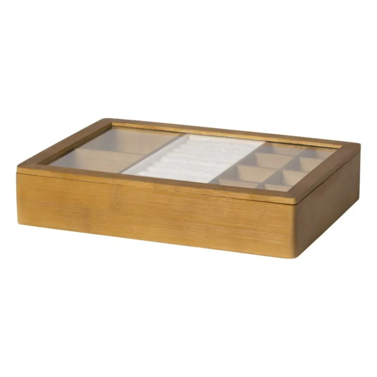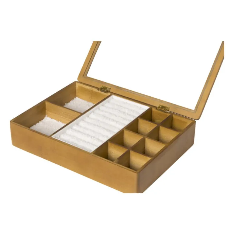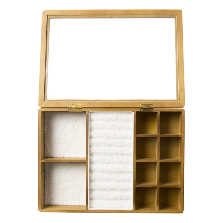 De sieradendoos heeft een hoogte van 5 cm, een breedte van 28 cm en een diepte van 20 cm. Deze sieradendoos heeft 12 vakken.