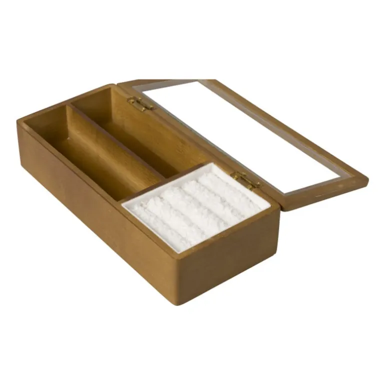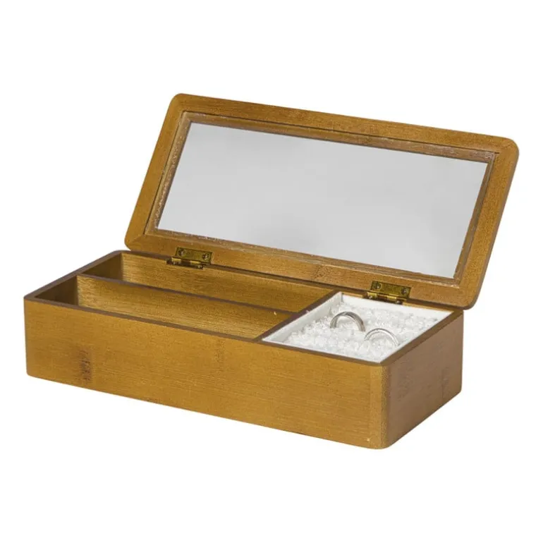 De sieradendoos heeft een hoogte van 5 cm, een breedte van 22 cm en een diepte van 10 cm. Deze sieradendoos heeft 3 vakken.