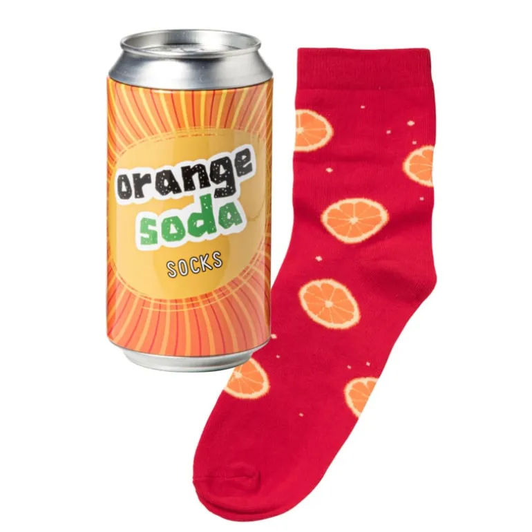 Geef een verfrissend cadeau met deze feloranje sokken, bedrukt met vrolijke sinaasappeltjes! Verpakt in een speels orange soda blikje, zijn deze sokken een verrassend en origineel cadeau voor elke gelegenheid. De sokken zijn gemaakt van katoen en polyester en door het one size fits all ontwerp zijn deze sokken het ideale cadeau voor vrienden, familie of jezelf.