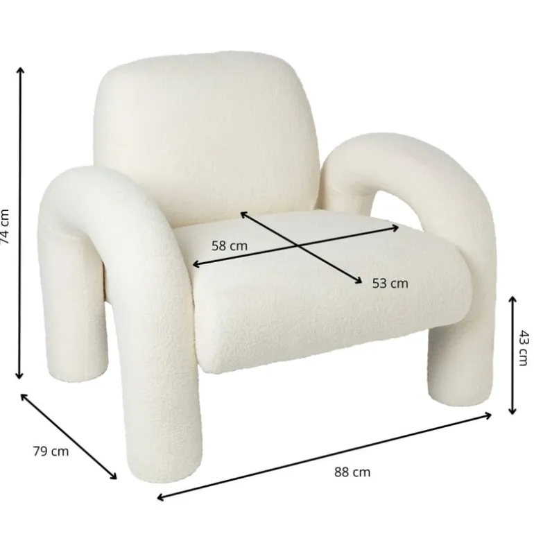 De stoel is 74 cm hoog, 88 cm breed en 79cm diep. De zithoogte van deze stoel is 43 cm. De armleuningen van deze sofa hebben een hoogte van 56 cm.