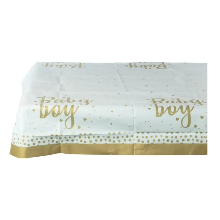 Dit blauwe tafelkleed met gouden accenten is perfect voor een babyshower van een jongetje. Het blauwe tafelkleed is aan de zijkanten versierd met de woorden ‘baby boy’ en is versierd met gouden details. Met een afmeting van 136×220 cm bedekt het moeiteloos elke tafel en zorgt het voor een feestelijke uitstraling.