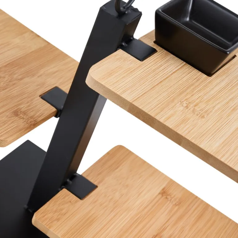 Op deze tapas etagère serveer jij je hapjes nu leuker dan ooit. De set bestaat uit een standaard, drie bamboe plankjes en een schaaltje.