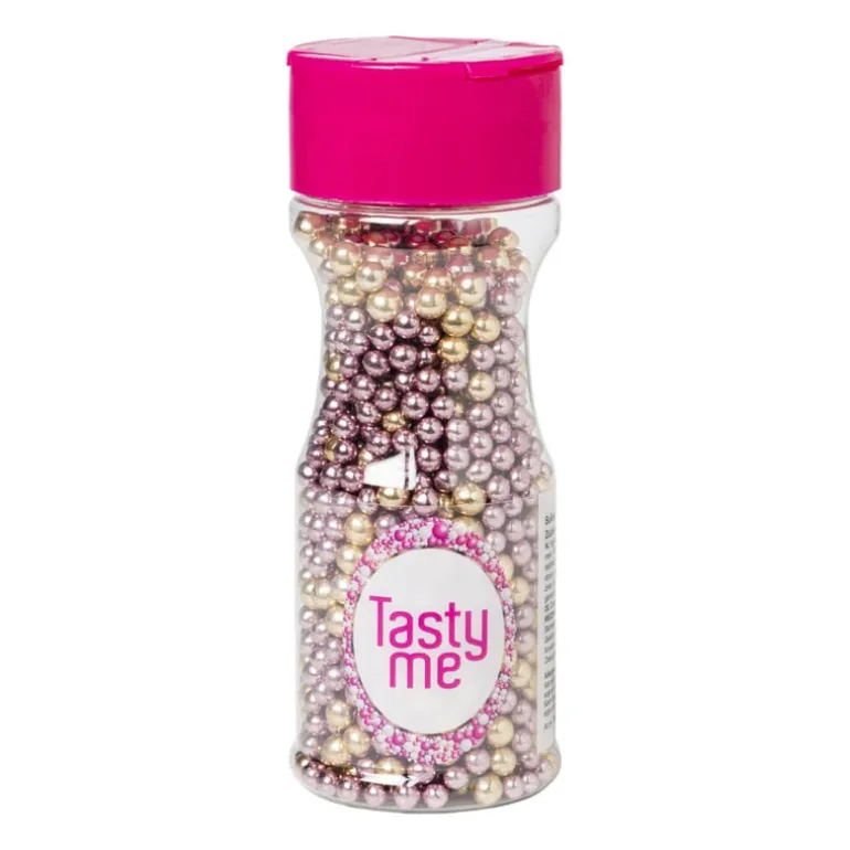 Versier je baksels met deze gave suikerparels. De parels hebben een metallic gouden en roze kleur. Zo valt jouw bakcreatie extra op! De inhoud is 70 gram.