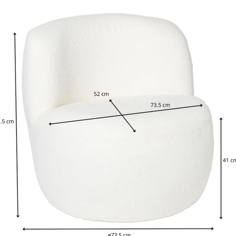 De fauteuil heeft een doorsnede van 73.5 cm en een hoogte van 71.5 cm. De zithoogte van deze fauteuil is 41 cm, de zitbreedte 73.5 cm en de zitdiepte 52 cm.