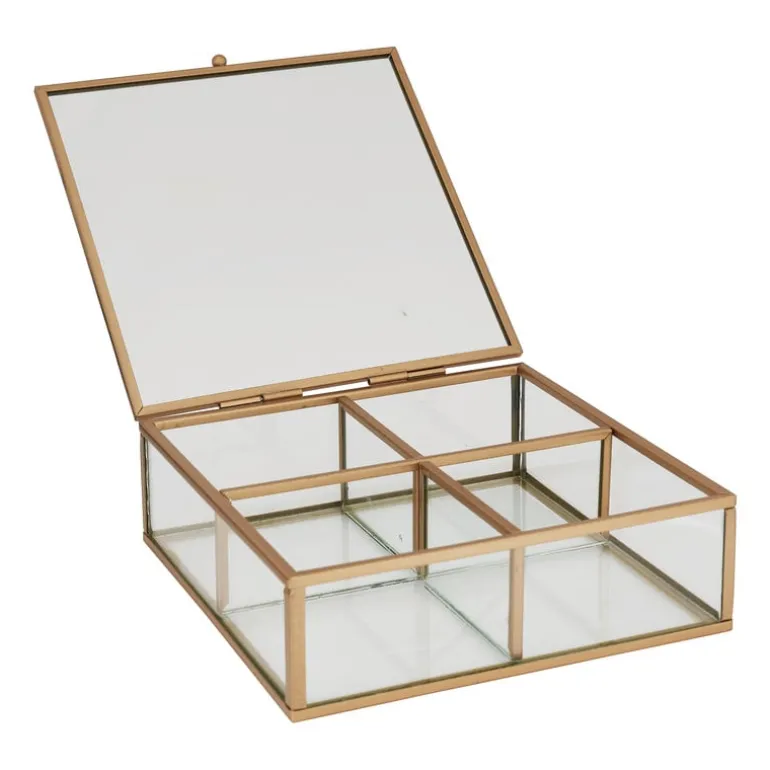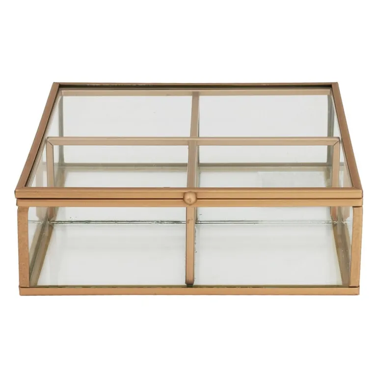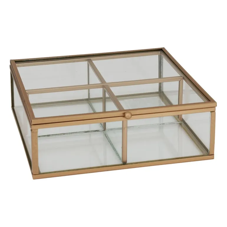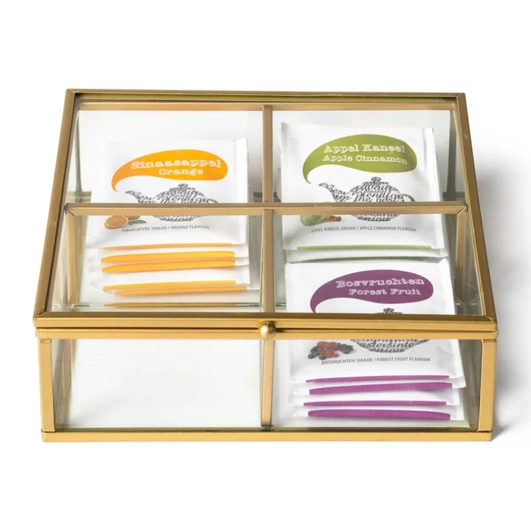 Deze theedoos van glas en metaal past perfect in een industrieel interieur. Bewaar jouw favoriete theezakjes in een van de 4 vakjes. Alles zit zo netjes geordend bij elkaar. De metalen theedoos is ook te gebruiken als sieradenopberger. Totaal iets anders, maar net zo mooi en functioneel! De afmeting is 15x15x5.5 cm.